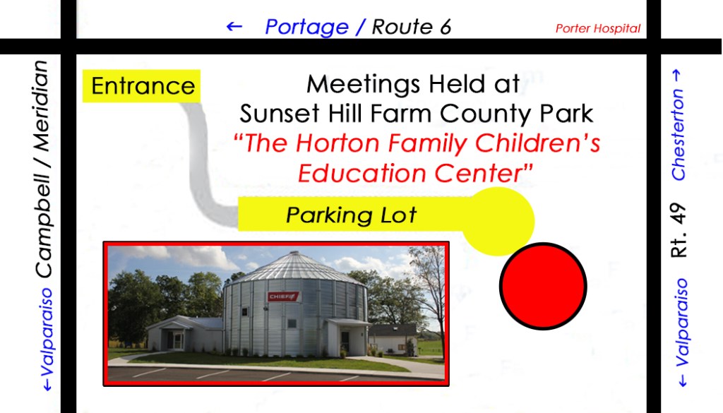 We meet at Sunset Hill Farm County Park, 755 Meridian Rd., Valparaiso, IN 46383 We meet in “The Horton Family Children’s Education Center” (See Map and photo)